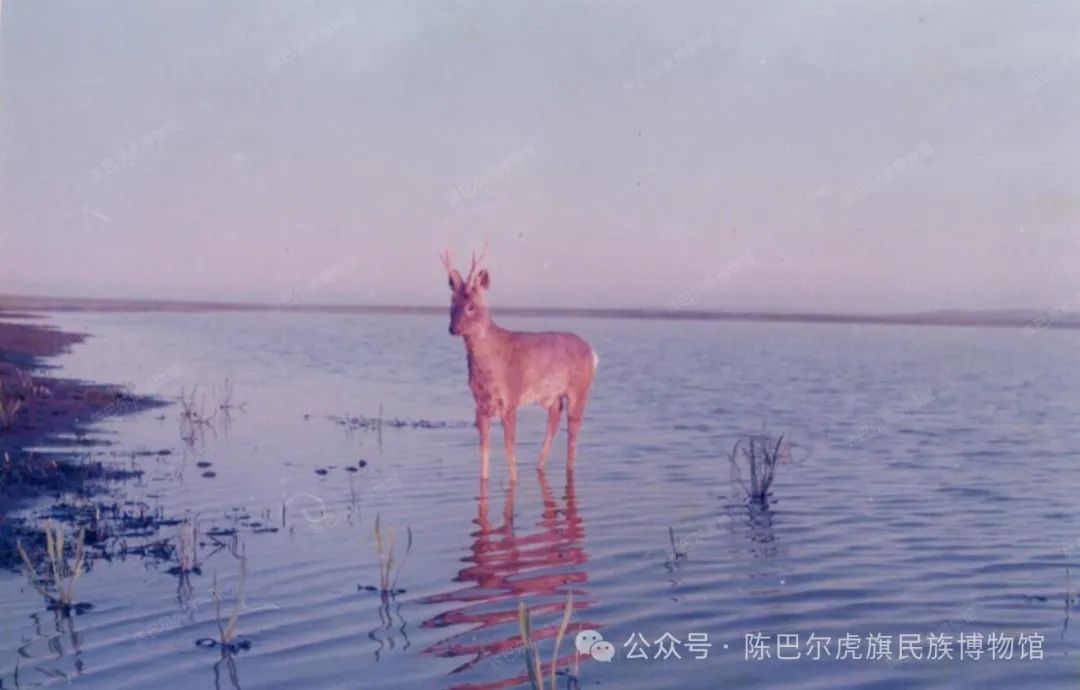 1987年8月的一个清晨,一只蹚过莫尔格勒河湿地的狍子。位置在今阿达盖南浩斯洛夫夏营地,雨季这里成为沼泽,这一带是大兴安岭余脉和草原过渡地区,狍子出没在山谷间,清晨或黄昏常有大群几十只混在牛羊群中来河边喝水。中午躲在在山谷内坡灌木下睡觉,很少在平原吃草。这只公狍子面向拍摄者愣住并没有逃走。猎人遵循传统,放过了这只狍子。