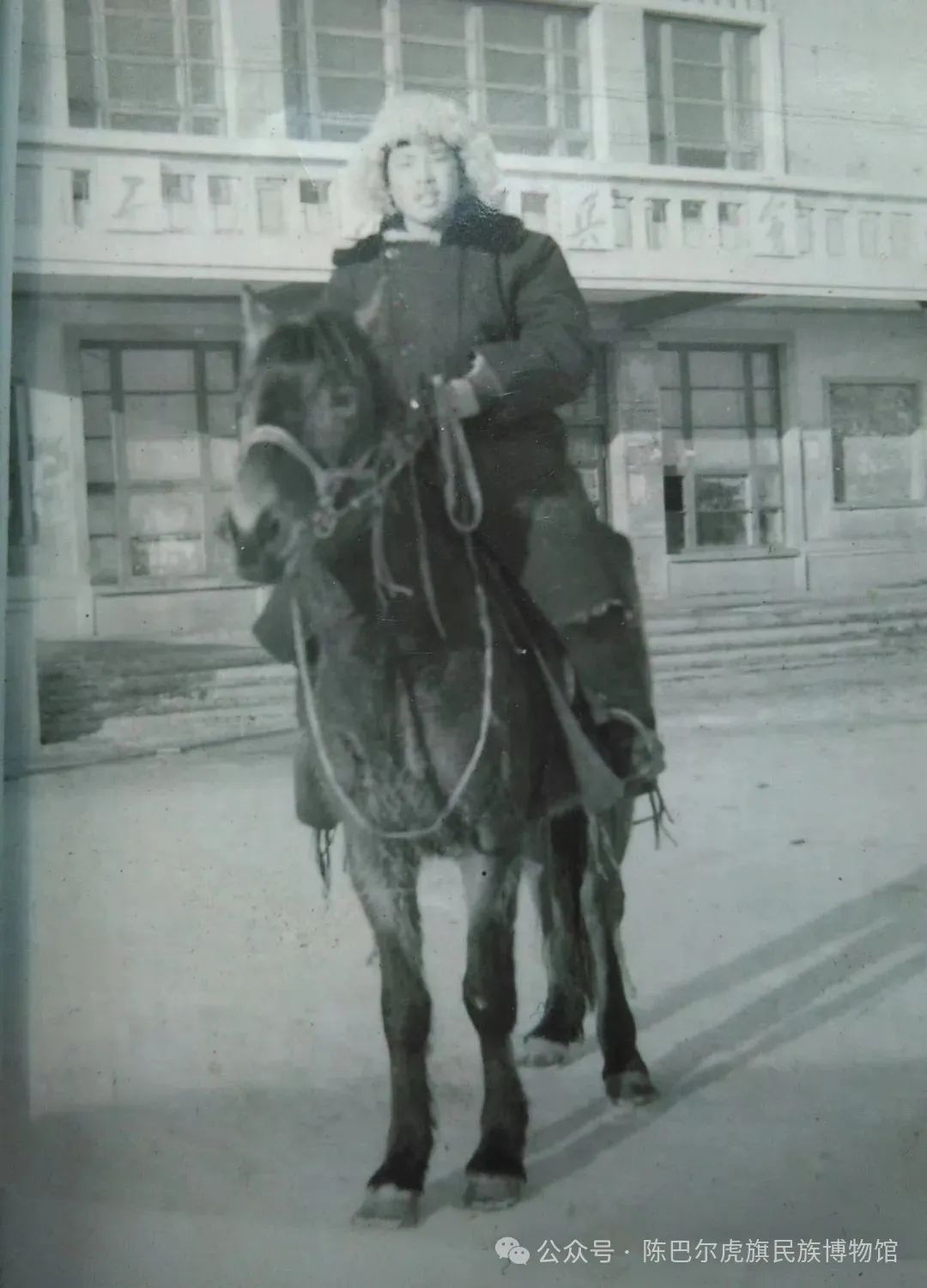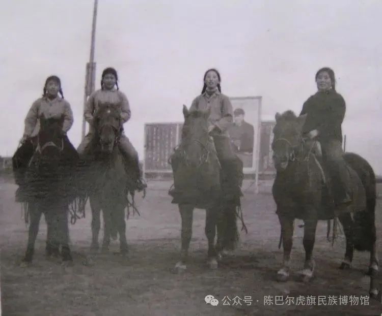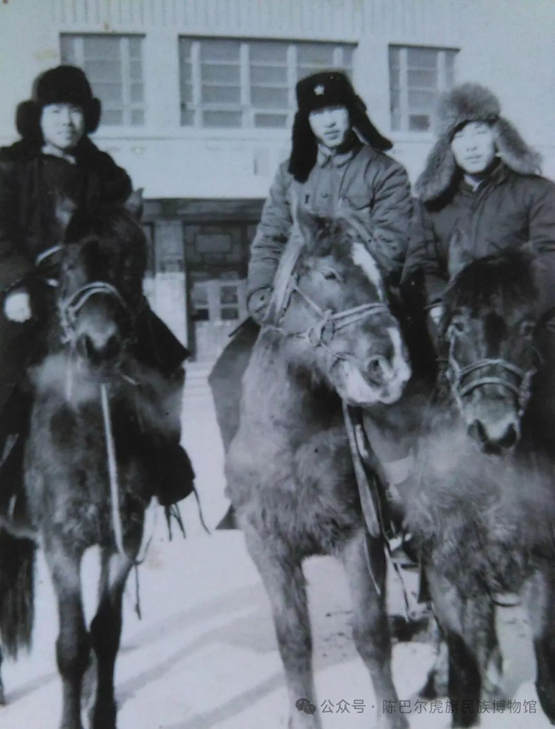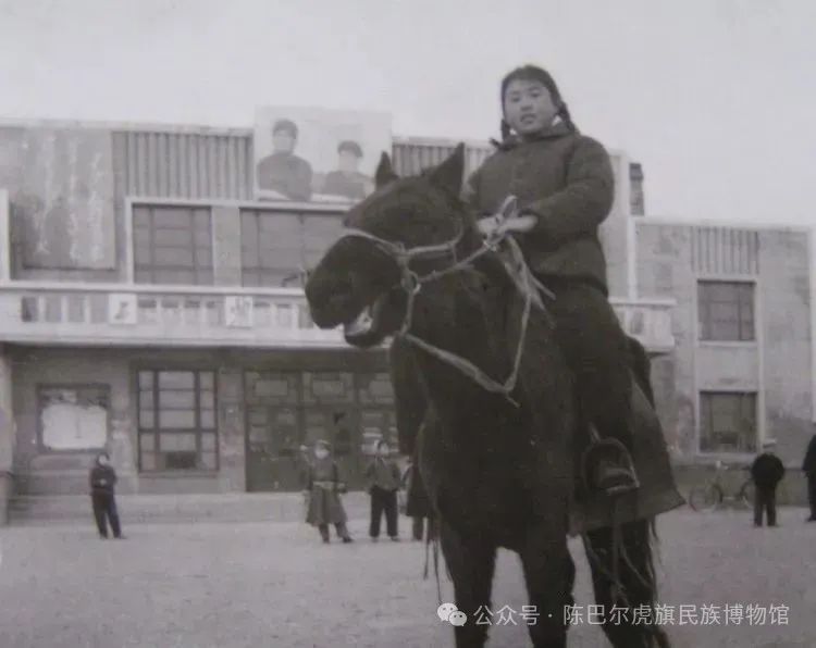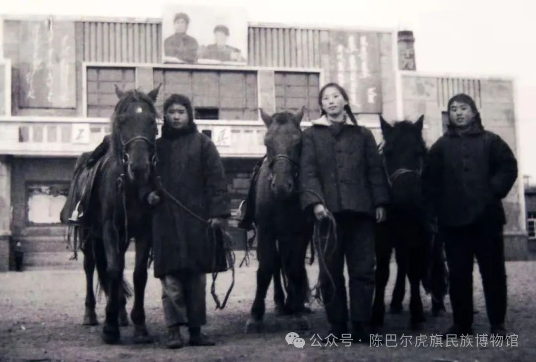 她们是1969年5月下乡到巴镇牧副队的天津女知青,她们学校有14个同学分在巴镇牧副队,这一天她们一个寝的4个女同学拽上队里的摄影师小哥唐为民从巴镇东山岗驻地骑上马浩浩荡荡来到电影院前合影。这些马都是牧副队集体的马匹,不用时放回马群。学习骑马是牧区知青必修课之一。照完一张合影四个女生骑马狂奔一阵想回来再拍单人照时孙迎春不慎摔下马来,头有点晕就没拍成单人照,三个女生又匆忙拍个合影,每人拍了张单身照后就陪她去接生婆苏太太家,她用毛巾把孙的头围起来,攥着拳头在小孙的头上敲了几下,吐了几口就缓过来了,这是草地蒙医治疗脑震荡的传统疗法,也有使用红绳攥头木棍敲击红绳的。一行五人惹了祸灰溜溜牵着马回队里了。四个女知青在牧副队院里合伙养了四只鸡吃蛋,但总是出工,鸡就饥一顿饱一顿了,慢慢就剩下一只了。孙迎春受伤后,姐仨就让唐为民把这只鸡杀了给她炖汤喝。她是牧副队的专职挤奶员,每天四点多就要起床,干的活最累,在大家的照料下孙迎春很快就恢复上岗了。这四人骑马照是电影院东南的政府广场旗杆下拍摄的,对面是百货、托儿所、新华书店、银行、邮局的平房,临路有个宣传架,书写有蒙古语语录和巨幅像。女知青扎着清一色的“俩小辫”,都18岁。穿着朴素的劳动服,朝气蓬勃。她们裤脚似乎都比正常裤子短一些,这是为防止劳动中泥水飞溅,牧区都这样装扮,看似彪悍了一点儿。这些女知青照片为同队天津知青唐为民使用天津产东方S1型135相机所拍,留下了大量照片。当初陈旗尚无照相馆,得拿到海拉尔市冲洗,没半个月是取不回来的。1971年冬季陈旗育新马场知青陶道借用政府马圈马匹在旗电影院门口留念,这一年15岁。这套衣服是知青办发的。海拉尔民族用品厂生产全套的香牛皮鞍詹,桦木鞍具和马镫、铜环提供牧区。但为了降低成本,生产队只买海拉尔产的香牛皮鞍詹,这个自己做不了,在买陈旗木器厂产的桦木鞍子,供销社的马镫子,知青们自己熟制笼头、水勒、肚带、胸带、缰绳、镫带等皮具组配。