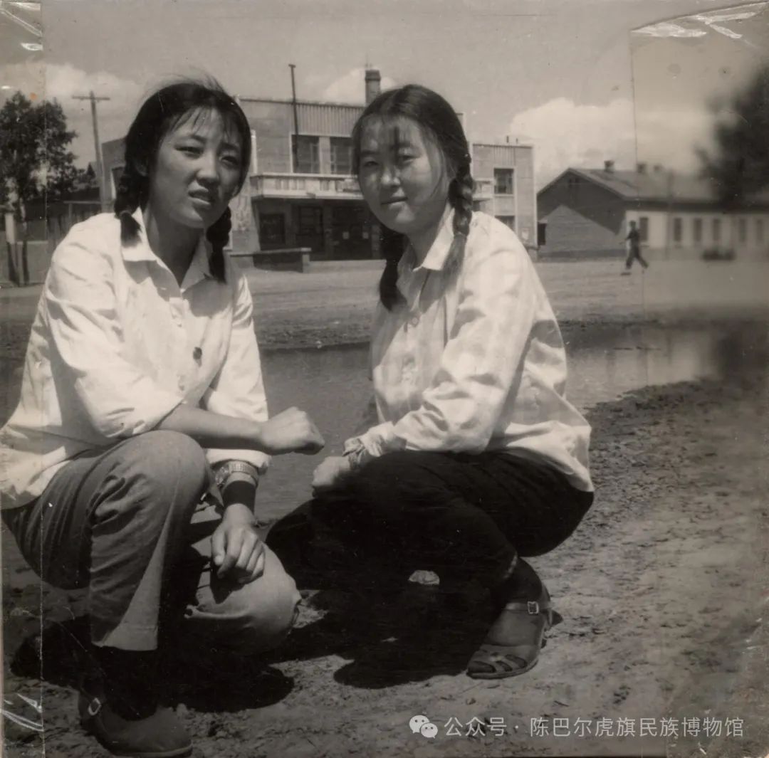 1974年夏季, 斯琴(左)与陈旗红卫中学高二(毕业班)同班同学斯日古楞在电影院门前合影,当年俩人均为18岁。第二年斯琴下乡到西乌珠尔三队当知青。斯日古楞下乡到东乌珠尔额尔敦乌拉队当知青。达如摄影(原呼伦贝尔日报社记者)