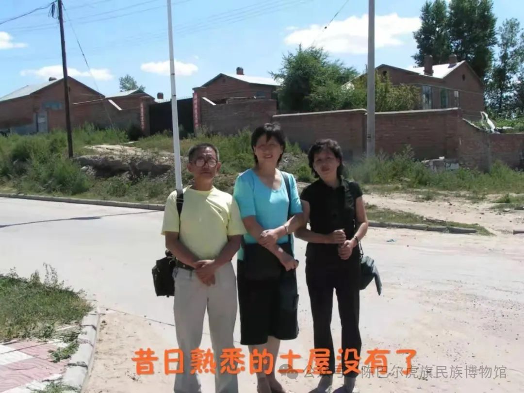 有一次记者哥哥回来了,要给堂妹照相,斯琴就领着红卫中学同班同学斯日古楞来到了电影院前留下了这张合影。因为有记者哥哥,她们家借光照了很多照相,清晰又专业。这时候的电影院墙壁上我们似乎能看到形势的一些变化。左面的旗委建筑拍出了一半,以电影院为中心,在布局上仍延续了“以左为尊”传统,建筑举架高大,窗口细高、壁炉式烟筒造型等仍受到了俄式建筑的影响。1956年开始的全国连续12年绿化运动成果在城镇显现,巴镇绿化树种虽然为单一的榆树和杨树,但道路两侧树木已郁郁葱葱。从画面看都是两人梳着流行的中分过肩三股双麻花辫和稀疏的刘海,穿着“的确良”衬衣和“迪卡”裤子,显然是这个时代夏季正装。她们俩是班级里第一批入团的,斯琴佩戴着团徽,从服饰难以看出是高中学生,劳动经历透出成熟干练和坚毅的气质。虽然只有广播和电影,城市流行的元素在边疆牧区的年轻人中迅速传播。闺蜜俩背对地标,在水一方,摆好姿势,面向镜头不约而同的挽起袖子,晒出了狠货-上海牌机械手表。2007年夏,天津知青回乡省亲,在牧副队原址下留念,左起:唐为民、宋家珍、许泽辉。