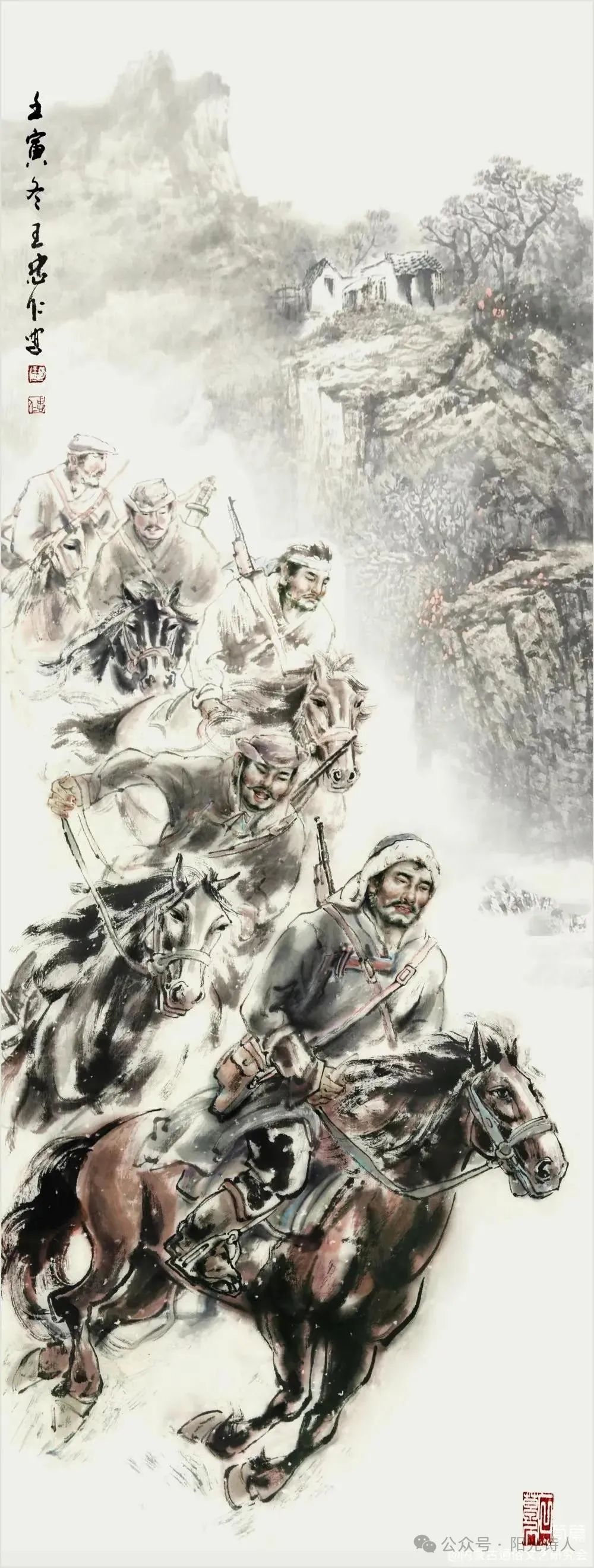 王忠仁老师的画作《骑兵》。骑兵作为历史上重要的军事力量,其英勇、豪迈的形象常常成为艺术家们表现的对象。王忠仁老师选择骑兵作为创作主题,是为了颂扬骑兵的英勇精神,展现他们在战争中的无畏与英勇。人物形象生动且富有张力,捕捉骑兵的神韵和意境。通过画面的整体布局和色彩运用,营造出一种独特的意境美,使我们在欣赏画作的同时,能够感受到骑兵那种勇往直前、无畏无惧的英勇精神。