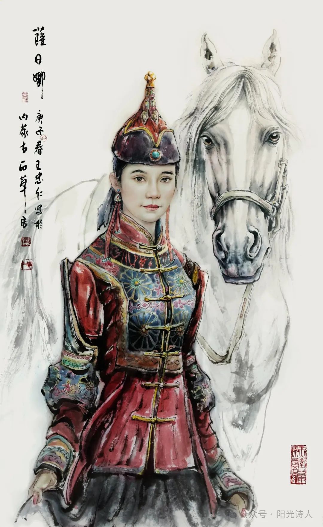 王忠仁老师的《乌兰其木格》与《萨日娜》,两幅佳作,分别捕捉了草原儿女的独特风韵。《乌兰其木格》中,女子眼神深邃,笑容温暖如草原初阳,红妆映衬下更显其飒爽与柔美并蓄的神采;《萨日娜》则展现了另一种温婉,姿态轻盈,似风中柳絮,眉眼间流露出不可言喻的柔情与坚韧,两幅画作共绘草原双姝,令人过目难忘。