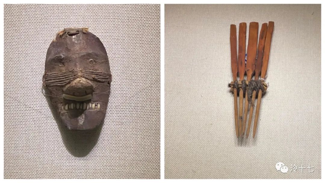 整个新疆博物馆我最爱的展品,没有之一。伏羲手上拿着矩,女娲手上拿着规,寓意天地方圆,人首龙身,龙(一说蛇)尾交缠,上方的圆象征太阳,下方的圆象征月亮,四周的圆象征星辰。更难得的是因出土较晚又在新疆这个干燥的地区,色彩仍然颇为鲜亮。这交缠的伏羲女娲被很多人说像DNA螺旋,虽然并未证实任何实际关系,却让人无法否认甚至不想拒绝这种没来由的神秘宿命。比伏羲女娲图更神的,只能是因《国家宝藏》火遍全国的五星出东方利中国织锦护臂。由中日尼雅遗址学术考察队成员于1995年在尼雅遗址发现。五星指金木水火土五大行星,出东方指五颗行星在一时期内同时出现于东方天空,中国指黄河中下游的京畿地区及中原。连起来就是五星出现在东方则于该地区有利。(左起)【距今3800年】木雕人面像、木梳,若羌县出土若羌,西汉时期西域楼兰国故地。原名婼羌,上世纪50年代因汉字简化被国务院无情地拿去了女字旁。一进新疆博物馆,就听到有人直接问楼兰美女在哪,我好奇查了一下,才知道此楼兰美女已经3000多岁了……没错,她就是被口耳相传的新疆博物馆镇馆之宝——楼兰干尸。据报道,她”身高约1.55米,现重10.1千克,面容端详、五官精致,全身上下没有有一丝腐烂,皮肤组织保存的也是极为完好,手臂上也可以看得见血管。”也不是没有犹豫过该不该把这几具干尸的照片放上来。考量有二:其一,他们也是博物馆展览的一部分,更是新疆博物馆独此一份。读者里一定有想了解却没时间去的人,如果引起了你的兴趣再去查阅资料,也是我的功德一件。其二,像这样的夫妻合葬,我看了不仅不害怕,反而能感受到一丝安宁。毕竟生命的终点不就是如此。退一万步讲,多多少少人消散在时间里,得以留存下来的,反而是一种福分。