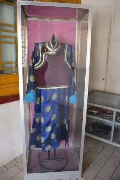 男装:身长133厘米,连袖宽200厘米;坎肩肩宽54厘米,身长60厘米;重1.30千克。1993年,由旧土尔扈特部末代王爷塔旺嘉布长子额日登格日勒之妻宝尔制作。额日登格日勒(1930-1981),塔旺嘉布长子。曾任额济纳旗旗长、中共阿拉善盟行署副盟长、内蒙古自治区第三届人民大会代表。其妻宝尔(1930-2004)为爱国民主人士。