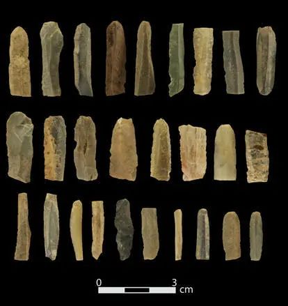 ↑金斯太旧石器时代遗址坍塌等堆积筛选出的细石叶。(内蒙古自治区文物考古研究院供图)
