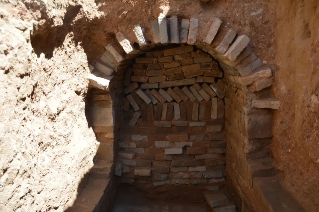 随着发掘工作的持续推进,一座坐北朝南的双人单室合葬砖券墓葬逐渐显露出来,墓道与墓室成“甲”字形,方形的墓室内西侧和北侧贴墙就地用陶砖垒砌两个棺床,两棺床呈90度夹角的“7”字形,两棺床上一横一竖有两具人骨,右侧放有一个木碗。墓室地面用陶砖铺砌,墓门位于墓室南墙东端,用陶砖封堵。墓室保存较好,没有发现盗掘痕迹。