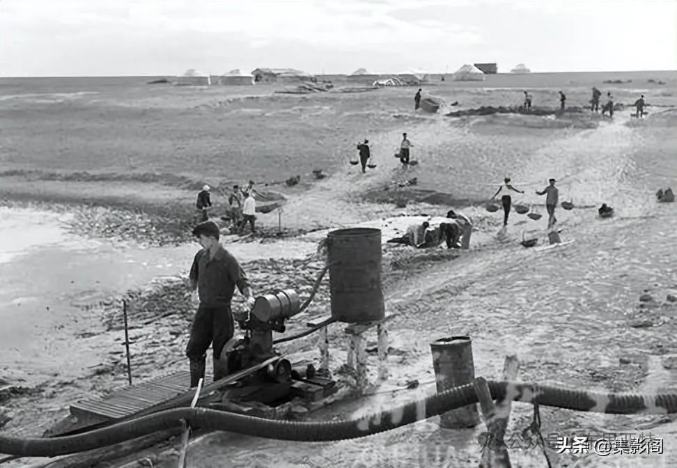 新巴尔虎左翼旗新宝力格公社附近,由国家投资正改建一座草原水库。这是工人正用机器抽水和开挖库底沉积的畜粪。
