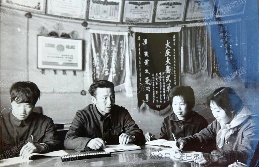 苏木领导接待内蒙古日报社、呼伦贝尔日报社采访东乌珠尔供销社的记者 左三:仁钦(内蒙古日报)左四:邦古(书记)左五:古日特木沙(苏木达) 1984年