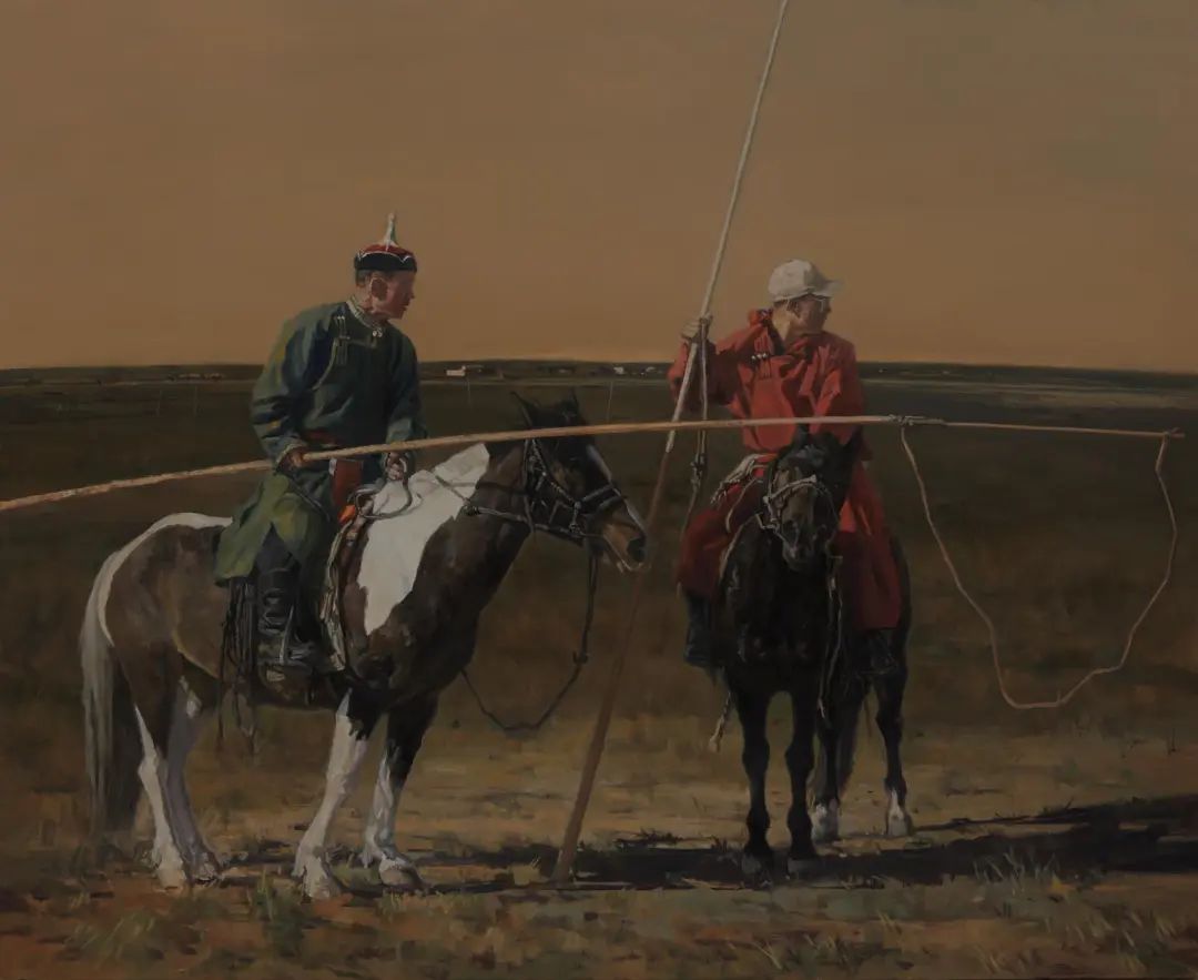 生命中有很多闪光点隐藏在内心深处,当它积累到一定程度就会连成线并形成面,它像极了由点线面构成的一幅油画,这幅画里有你曾经的痕迹,当它外溢时自我就想通过某种形式把它表达呈现出来。人类表达情感的艺术形式多种多样,绘画就是其中的一种形式。黑格尔在美学论著中说过:“人类通过艺术保存自己新鲜有利的情感,内在情感通过外在事物的反应把自己内在的东西表现出来”。人生有很多阶段:婴儿期、童年期、青春期、成年期、老年期,我们都曾经走过或正在路上。作为复杂人所得到人生体验都不尽相同,每个人都是独特的,就如同那句“一千个人眼中有一千个哈姆雷特”的话语。法国画家高更用画作《我们从哪里来?我们是什么?我们往那里去?》 来呈现出来自己某个阶段的所思所想,它的经典画作也打开了艺术创作者的终极大门。我的这几幅过去时作品,在创作题材来说是和我的童年记忆相关联,它隐藏在记忆深处,每当成年过程中有灰色笼罩时它的金色随时出现给我力量,让我走出阴霾。我出生在科尔沁草原一个半农半牧的小山村,在长辈的呵护下那里无忧无虑的生活到七岁。那里有延绵的青山、富饶的草场、成片的野花、潺潺的小溪、和讯的阳光。每天清晨牛倌的吆喝声把你叫醒,家里牛群发着闷闷声音随着队伍上山吃草;中午跟随大人牵着马匹到草场吃草,不想回来时就慵懒的躺在马匹旁边仰头的看着天空发呆;半晚升腾的炊烟伴随着大人吆喝牛犊的声和挤牛奶的哗哗声结束一天。如今回想那段美好时光与后来进城生活的不适、窘迫、烦恼对应形成鲜明反差,这正是符合弗洛伊德心理分析学中儿时潜藏记忆对人生后期有深刻影响之学说。每当创作绘制某个形象时隐隐约约的想到儿时长辈扶我上到马背前行;好像那是坐在大人自行车后面在蜿蜒山路行进,风从耳边吹过路边的鲜艳的野花向你点头。记忆虽然模糊了但又好像莫名的清晰,每一个形象都像是某一个熟悉的长辈或是记忆里的玩伴长大后的样子,每一匹马也好像是小时候牵过那匹骏马。创作画面因美好都是以具象的形式保留在脑海,所以绘制也是以具象绘画形式呈现。这些作品在绘制程中每当思绪混沌,画面错乱时都有好朋友点拨相助避免了半途而废,感谢亲情指导。从现今的绘画发展史来看,各种流派、各种风格以日新月异速度进行演变和进化,作为参与者的自己已经感受到巨大的冲击波,当下的创作沿袭传统具象绘画?还是转变到抽象绘画、表现绘画、Ai绘画?路在何方?哲学家苏格拉底提出:“艺术是难的”这一观点,这些问题摆在我们面前也是煞费心思,我想适合自己特性、适合自己节奏能在实践中残留下来共情、自洽的作品是最好的。总之,以上作品是上个时间完成的,当下还对有别的创作题材、其它的表现形式充满好奇心,以孩子的心态去探索实践将是进行时。歌德说过;“不论你们的头脑和心灵多么广阔,都应当装满你们时代的思想感情,作品将来自然会产生的”。光阴飞逝、时不我待能在感受到阳光的温暖,清风吹拂脸庞舒爽的时间段参与自己喜欢事情抒发美好的内心情感是一件惬意的事,且行且珍惜。