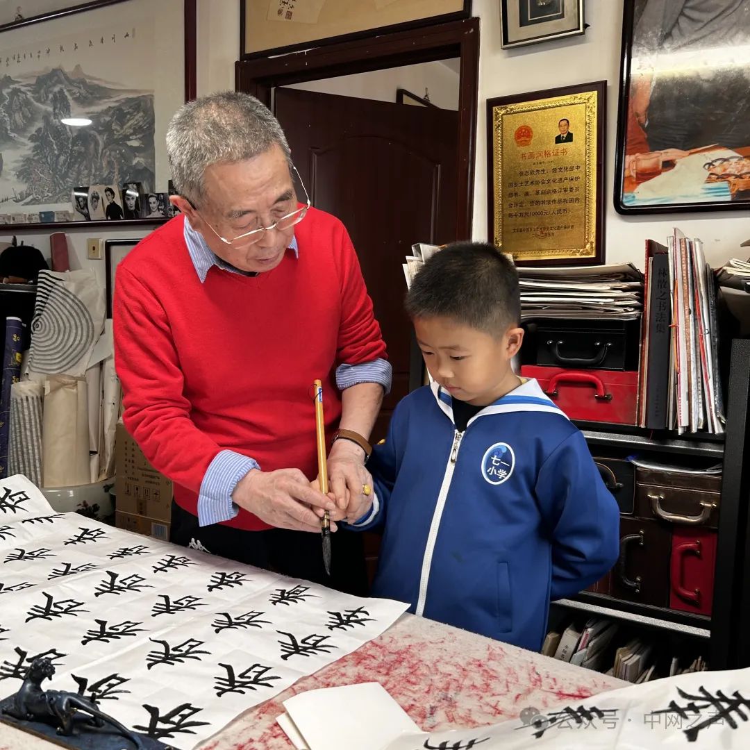 然而,功成名就的漠公没有躺在荣誉的桂冠上享受,而是选择深居浅出,潜心于书法教育。他深知书法艺术的传承需要一代又一代的努力,而自己肩负着培养下一代书法人才的重任。我曾经与他的几位弟子谈及他的书法教学,弟子们说,他的书法课堂充满了欢声笑语,在快乐中学习,在兴趣中成长,教“书”育人是他教学最大的特点。他教学生写书法的时候,不仅仅是传授书法技巧,更是教学生从汉字中理解做人做事的规矩礼数与道理。有一回我到他的工作室串门儿,就亲眼目睹了他给学生上课时的情景。他拿起毛笔蘸了蘸墨汁,在洁白的宣纸上写下一个“人”字。他对一位看上去只有七八岁的男孩子说:“你看,这‘人’字,简单两笔,却蕴含着深刻的哲理。这一捺,要稳稳地支撑着那一撇,就像人在生活中,要相互扶持,相互帮助,只有这样,我们才能站得稳,走得远。”男孩子聚精会神地听着,眼睛里闪烁着知识的光芒。在教学生写“正”字时,他又说道:“这个‘正’字,横平竖直,每一笔都要写得端端正正。做人也是如此,要正直,要光明磊落。无论遇到什么困难和诱惑,都要坚守自己的原则和底线。”男孩子似懂非懂地点着头,就连站在一旁的孩子父亲也感同身受地连连称是,手中的毛笔也不自觉地更加用力,仿佛要把这做人的道理深深地刻在纸上。有一次,一个学生在练习书法时,总是写不好一个字,急得满头大汗,甚至有些气馁。漠公走过去,轻轻地拍了拍他的肩膀,微笑着说:“孩子,别着急。书法就像人生,不可能一帆风顺,总会遇到一些挫折和困难。但只要你有耐心,有毅力,坚持不懈地努力,就一定能克服困难。来,我们一起看看这个字,你看,这里稍微调整一下角度,是不是就好看多了?”在漠公的耐心指导下,学生终于写出了漂亮的字,脸上露出了开心的笑容。