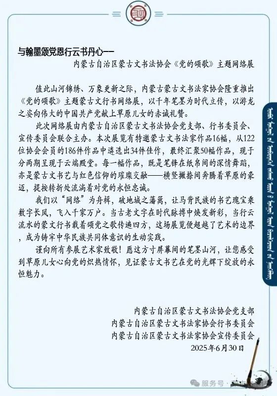 内蒙古自治区蒙古文书法家协会《党的颂歌》主题行书网络展评审委员会