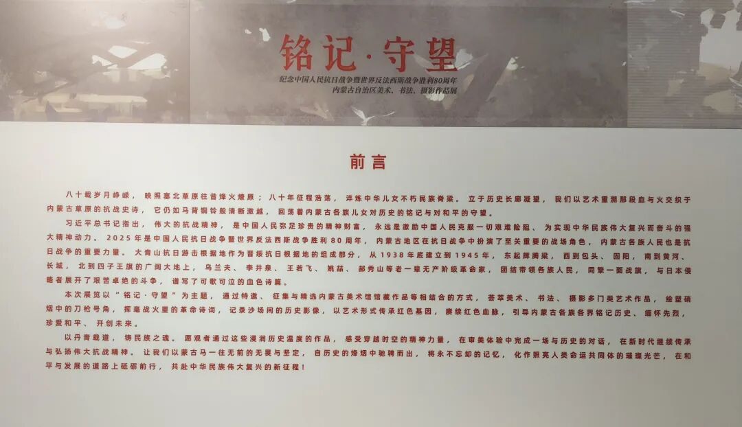由内蒙古自治区文学艺术界联合会主办,内蒙古美术馆、内蒙古美术家协会、内蒙古书法家协会、内蒙古摄影家协会承办的《铭记·守望——纪念中国人民抗日战争暨世界反法西斯战争胜利80周年内蒙古自治区美术、书法、摄影作品展》在内蒙古美术馆展出。