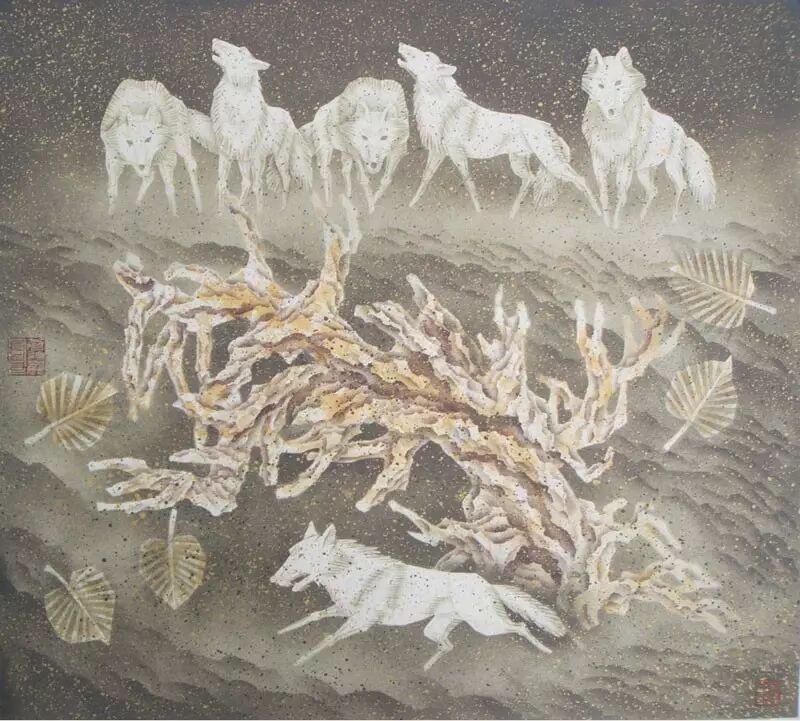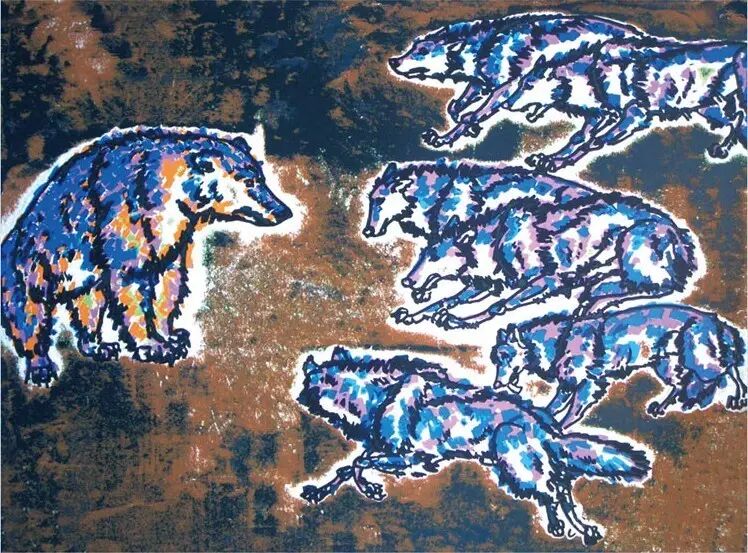 《苍狼与大地》丝网版/60x71cm/2001年(入选“2008·北京奥运美展”、“浩瀚草原·全国美术作品展”)