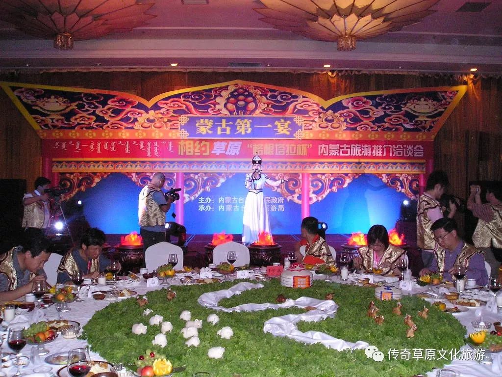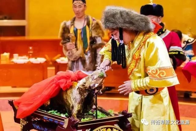 用餐开始了。八名武士抬入烤全牛(诈马),最尊贵的宾客为全牛剪彩。这个剪彩比较简单,只是用刀在诈马的额上划一个十字,然后用清洁的食品抹一下,接下来再用司仪敬来的酒行萨察礼。所谓萨察礼,是指食用饮食品之前敬献天地祖先的一种礼俗,是蒙古族饮食文化中的重要礼俗之一。蒙古人认为一切饮食都是天地祖先对人类的恩赐,所以每个人在享用饮食品之前必须进行萨察礼来表达自己的感恩之情。萨察礼的具体操作过程是:首先敬献苍天,其次敬献大地,再次敬献祖先,即一般进行三次萨察礼。行萨察礼的人必须恭敬地站立并且整理衣帽之后,用右手无名指沾杯中酒向天地弹洒三次,表达自己的真诚。萨察礼过后,开始歌舞表演,蒙古族歌手不断上台献歌,唱的都是耳熟能详的草原歌曲。