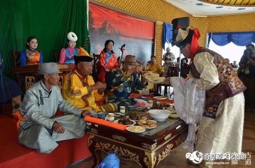 客人们依次落座,司仪开始用蒙古语念颂:“至高苍天之上,/统领万物众生,/光辉普照瞻洲,/恩赐十方百官千职……”