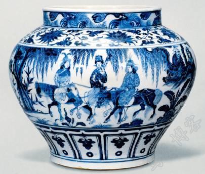 青花瓷器正是蒙古时代和元代中国的象征。做绀青染色是伊朗一带的习惯和偏好,而不是中华的。作为上绘颜料的钴也如此。不过,伊朗主要为陶器,瓷器则是中华的特产。到了蒙古时代,在主要由政府指定的官窑景德镇生产的这种东西方融合形成的青花瓷器,伴随着大元汗国的通商政策,经由印度洋上的通路大量送至伊斯兰中东地区,而不只限于大元汗国治下领域。那是蒙古时代“欧亚通商圈”最大的畅销商品,深蓝和白色相间的调和效果成为“时代的品味”而普及,其生产及出口甚至持续到明代以后。另一方面,伊斯兰中东则产出奥斯曼王朝伊兹尼克(I4znik)陶器等“仿制品”,不久也普及到欧洲,成为荷兰的代尔夫特蓝陶(Delfts blauw)等,终于在现代世界中成为我们的日用品。此一器物的历史演变大致如此。
