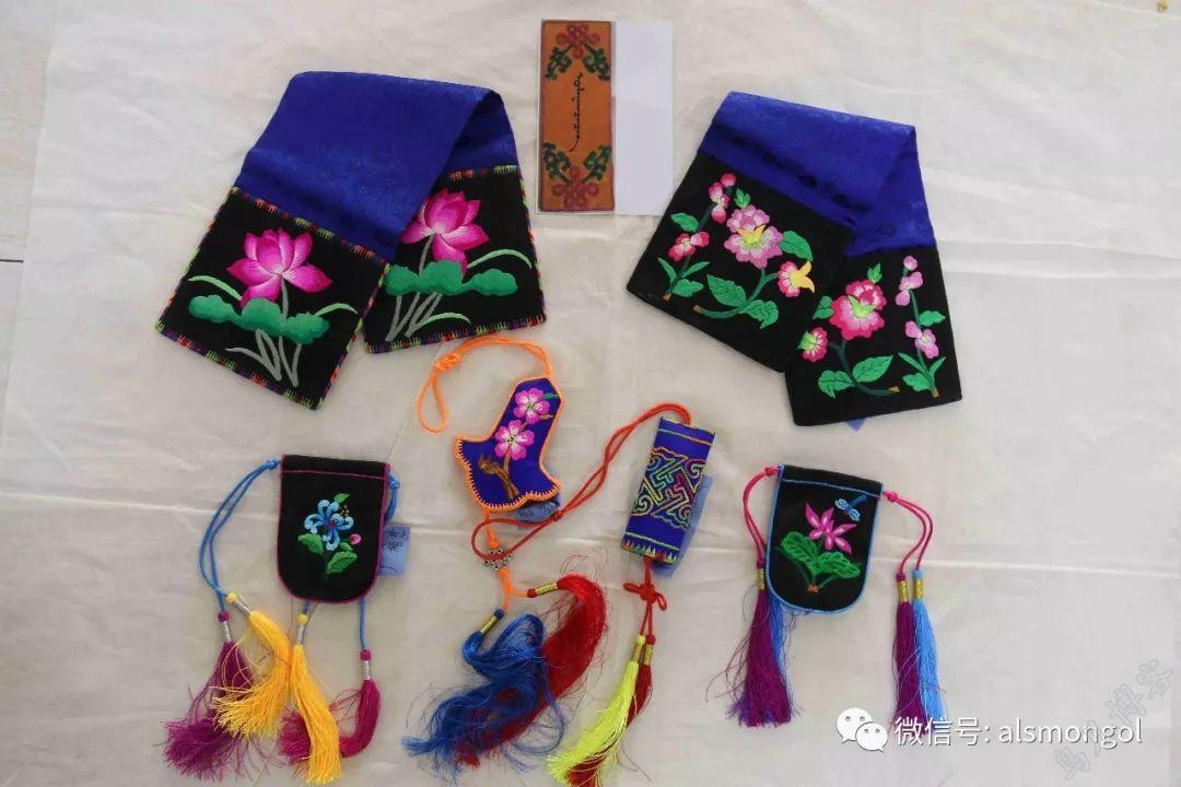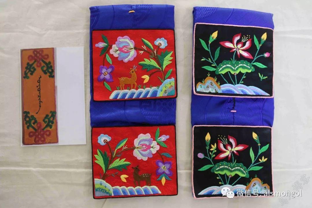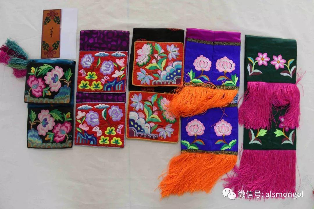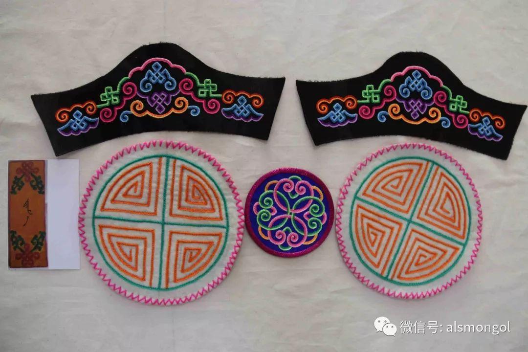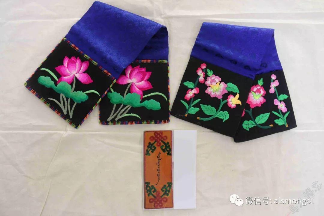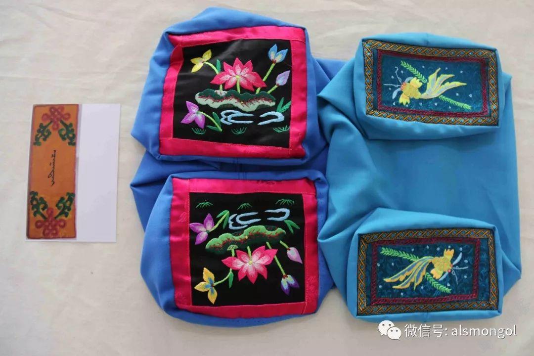 蒙古族刺绣,不但体现在软面料上,而且还用驼绒线、牛筋线等在羊毛毡、皮靴等硬面料上刺绣。刺绣针法也与其他民族有所不同,有自己的特色。刺绣艺术不仅纤细秀丽,而多以凝重质朴见长。其大幅的贴花,粗犷匀称的针法,夸张对比的色彩,给人以饱满充实之感。刺绣构图奇巧,多用于服饰和佩饰的装饰,部位曲直搭配,讲究对称。不论是坎肩、衣领、还是袖口,图案都能起伏变化,自然连缀。有的纹样还与特殊的部位相配合,显得雍容大方。
