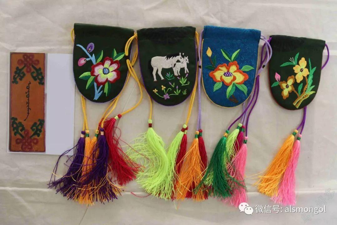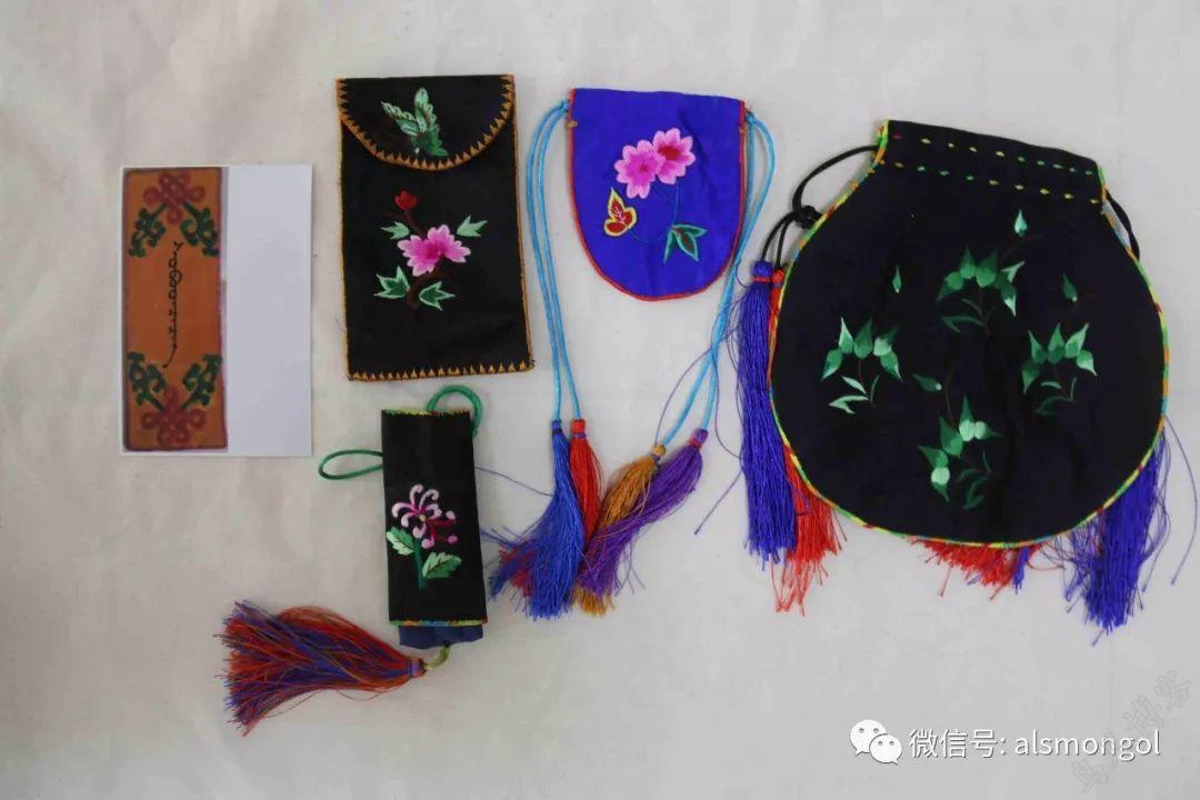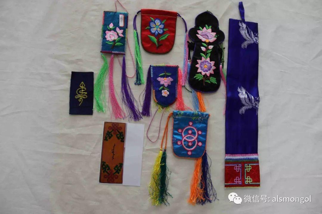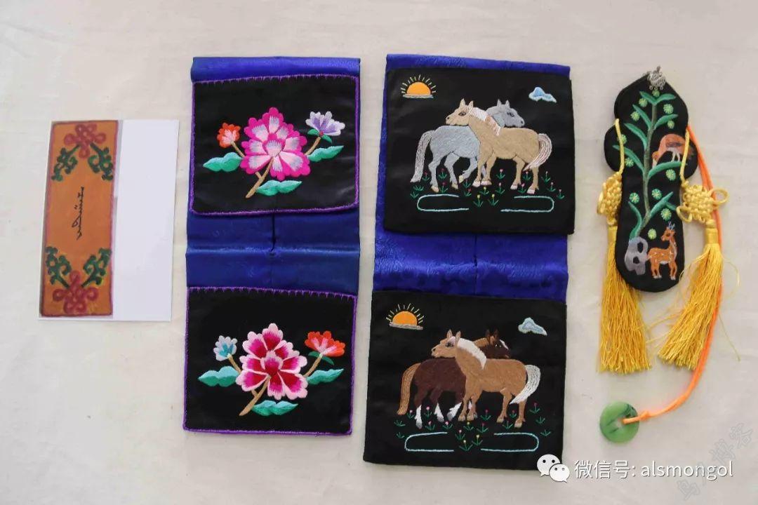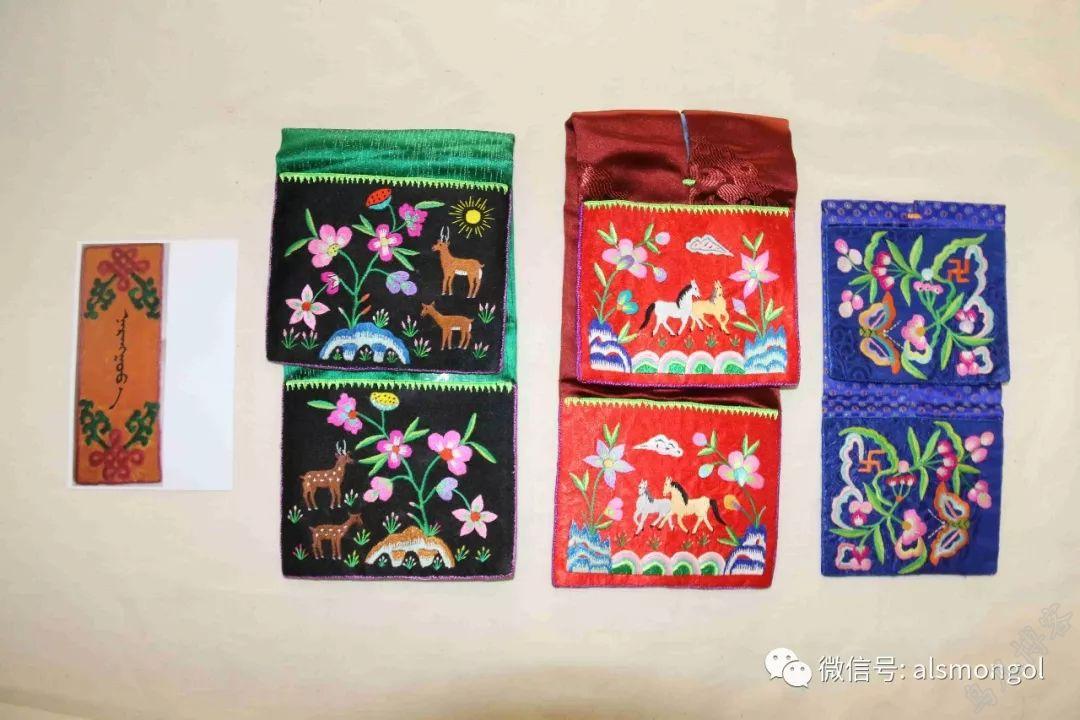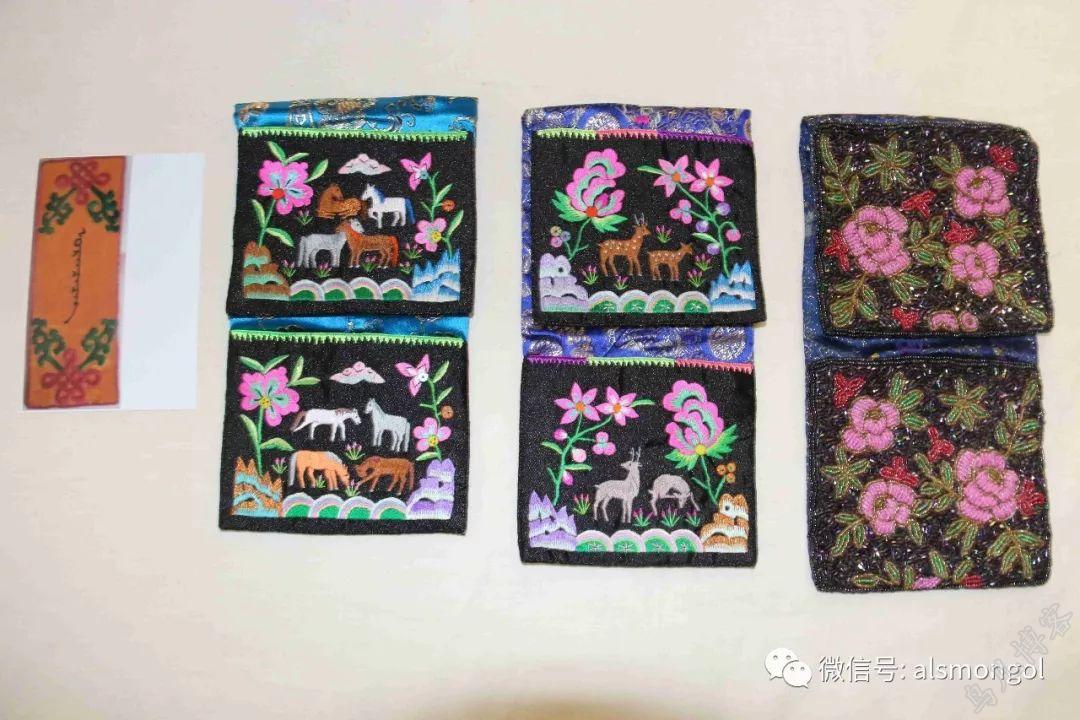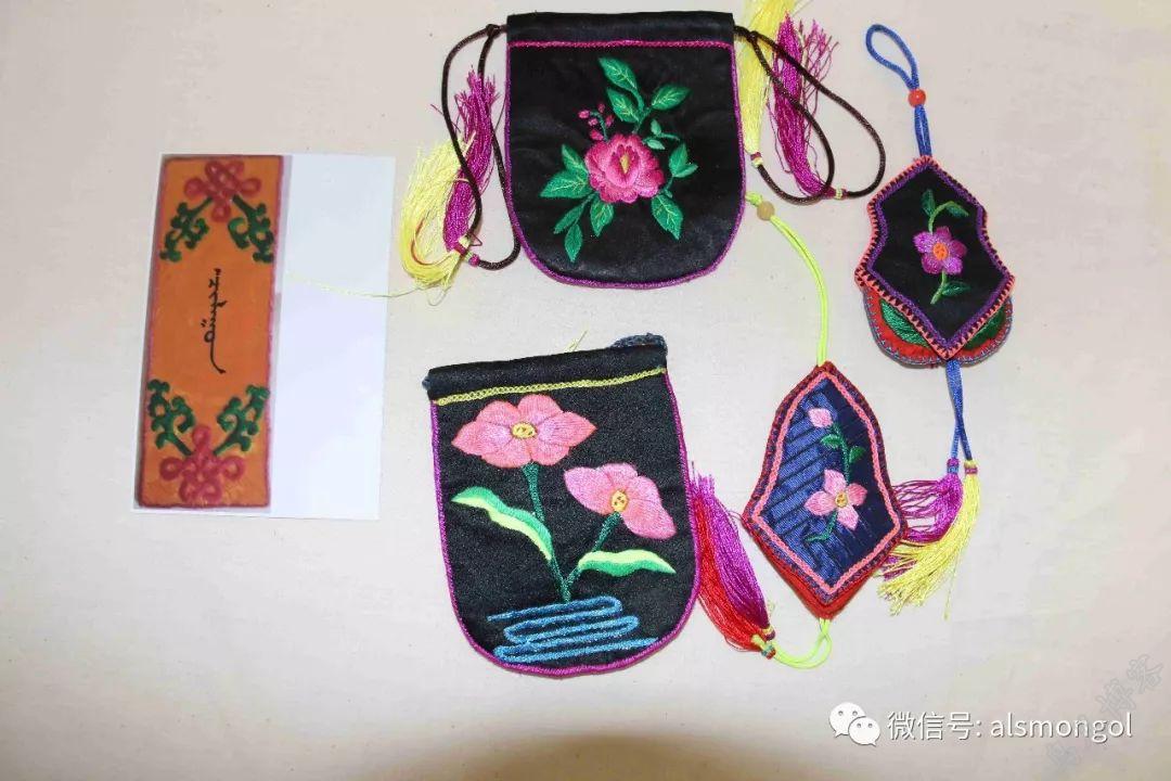 蒙古族刺绣,不但体现在软面料上,而且还用驼绒线、牛筋线等在羊毛毡、皮靴等硬面料上刺绣。刺绣针法也与其他民族有所不同,有自己的特色。刺绣艺术不仅纤细秀丽,而多以凝重质朴见长。其大幅的贴花,粗犷匀称的针法,夸张对比的色彩,给人以饱满充实之感。刺绣构图奇巧,多用于服饰和佩饰的装饰,部位曲直搭配,讲究对称。不论是坎肩、衣领、还是袖口,图案都能起伏变化,自然连缀。有的纹样还与特殊的部位相配合,显得雍容大方。