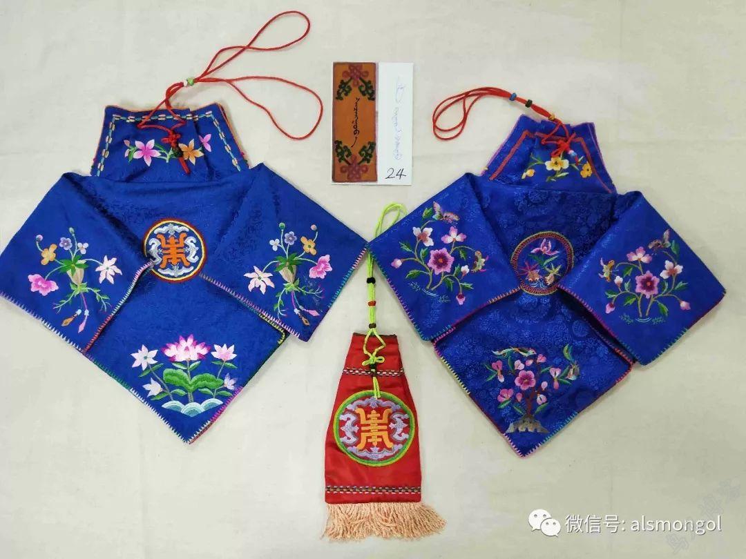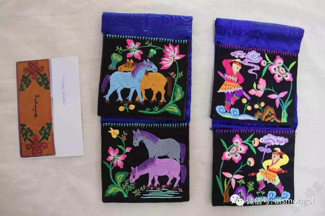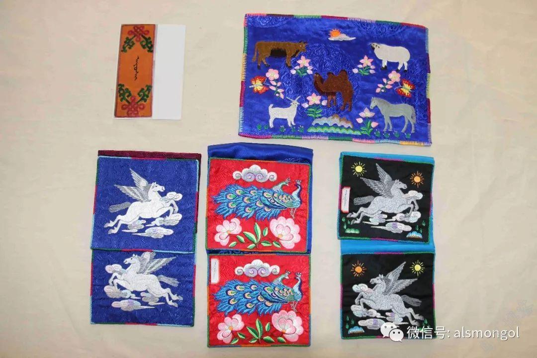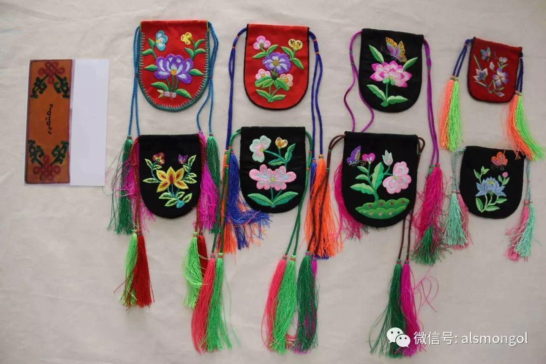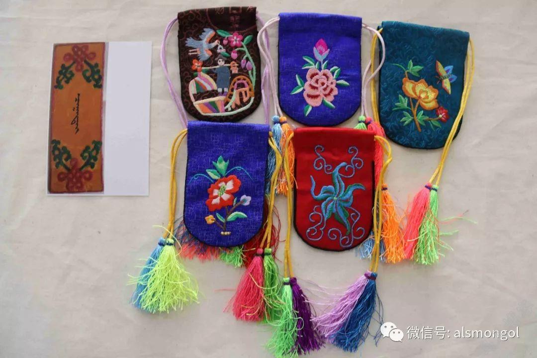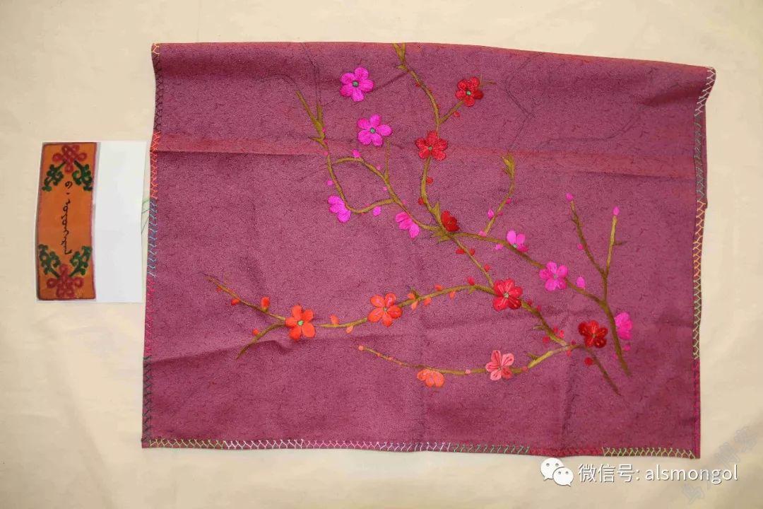 蒙古族刺绣,不但体现在软面料上,而且还用驼绒线、牛筋线等在羊毛毡、皮靴等硬面料上刺绣。刺绣针法也与其他民族有所不同,有自己的特色。刺绣艺术不仅纤细秀丽,而多以凝重质朴见长。其大幅的贴花,粗犷匀称的针法,夸张对比的色彩,给人以饱满充实之感。刺绣构图奇巧,多用于服饰和佩饰的装饰,部位曲直搭配,讲究对称。不论是坎肩、衣领、还是袖口,图案都能起伏变化,自然连缀。有的纹样还与特殊的部位相配合,显得雍容大方。