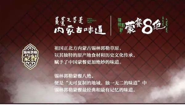 带着锡林郭勒大草原的广阔壮美,带着马背民族的豪迈勇猛,带着原生态食材的自然新鲜,带着蒙古族烹饪技艺的原汁原味,带着锡林郭勒草原部落的文化传承,锡林郭勒蒙餐八绝豪迈登场!
