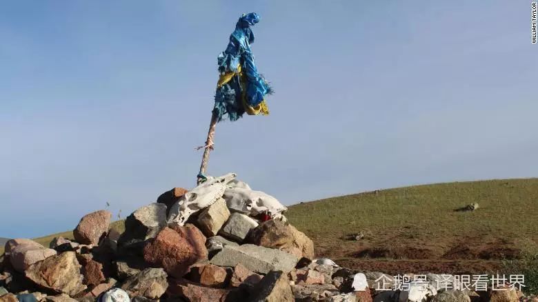 这就说明,游牧民族在兽医护理学上的成就实际上是公元前一千年中欧亚大陆发生巨变的一个主要驱动力。图为当地人民举行祭祀仪式,类似玛尼堆上放置了多个马头骨。